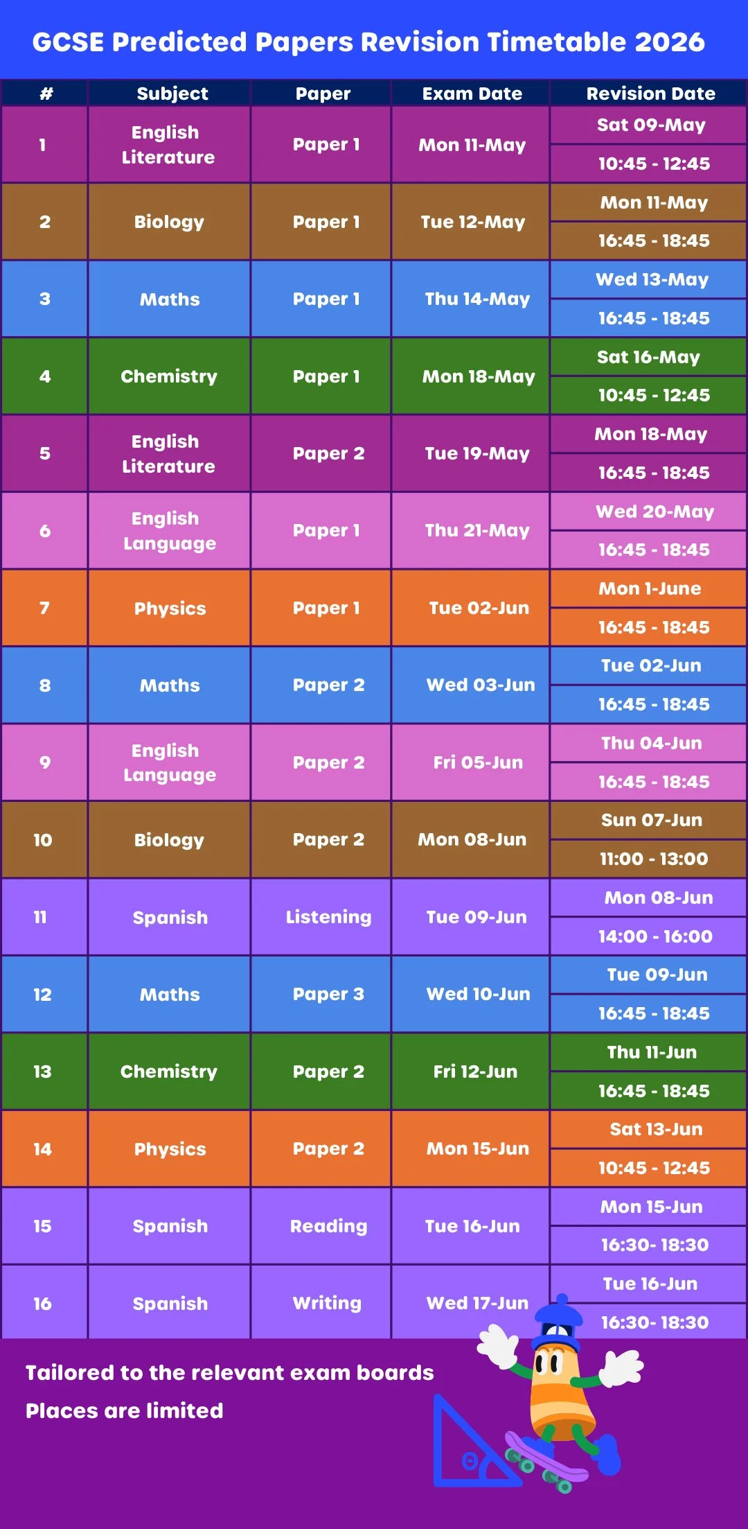 Our predicted paper sessions are 2-hour revision blocks scheduled 1 or 2 days before each GCSE exam. The current timetable runs from 9 May to 16 June 2026